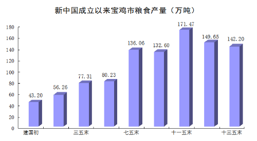 20世纪初,封建土地私有制的桎梏,小农经济的束缚,严重阻碍了生产力的发展,加之自然灾害频繁、苛捐杂税、植被破坏、农田失修,农业生产长期处于低产落后局面。1949年,全市粮食总产量只有43.2万吨,亩产仅67.5公斤。新中国成立以后,历经农田水利设施建设,家庭联产承包责任制、农村土地制度、农村集体产权制度、全面取消农业税等一系列深层改革,宝鸡市农业生产力得到极大释放。特别是近年来,我市始终坚持农业农村优先发展,以乡村振兴为总抓手,深入推进农业供给侧结构性改革,聚力打造特色现代农业强市,农业综合生产能力全面提升。