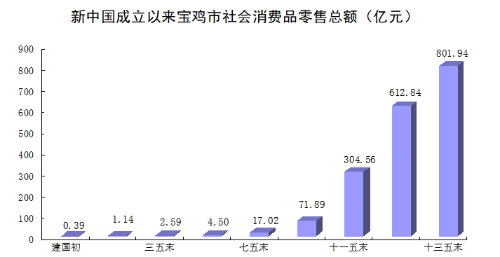 多元商贸流通格局形成。1949年,全市社会消费品零售总额仅3930万元,到1978年增长到3.42亿元。改革开放后,市场活力快速释放,消费内容日益多元,商品消费优化升级,文化、旅游、体育、健康、养老、教育等领域消费日渐丰富,逐步形成消费品市场遍布城乡,流通网络四通八达,商场货源供应充足,消费内容丰富多元的商贸流通格局。新世纪以来,国美、苏宁、人人乐等国内知名连锁机构相继落户宝鸡;开元商城、新东岭城市综合体、吾悦广场等综合性购物中心先后建成运营,截至2020年末,全市限额以上商贸流通企业达到115户,全年完成社会消费品零售总额801.94亿元,是1949年的2056倍,年均增长11.3%。