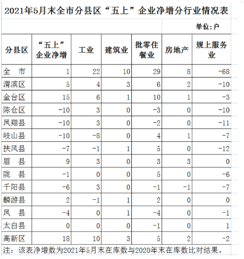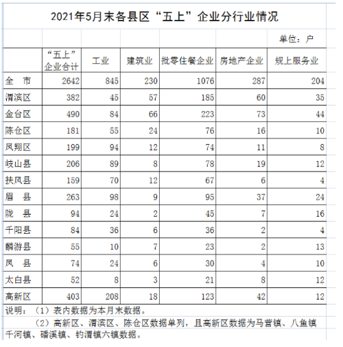 截至2021年5月末,全市共有“五上”企业2642户,扣除退库因素,同比增长3.6%,其中规上工业845户,同比增长5.6%;资质以上建筑业企业230户,同比增长17.9%;限额以上批发零售住宿餐饮企业1076户,同比增长5.5%;房地产开发经营企业287户,同比增长5.9%;规上服务业企业204户,同比下降22.7%。(分县区情况详见下表)