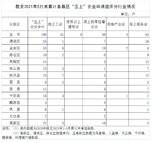 截至2021年5月末全市累计申请退库198户,退库数量相比往年显著增多。分行业看,工业退库31户,限额以上批发零售住宿餐饮企业退库80户,房地产开发经营企业退库3户,规上服务业企业退库84户。限额以上批零住餐企业和规上服务业企业退库数量分别占退库总数的40.4%和42.4%。分县区来看,金台区、渭滨区、扶风县、高新区退库企业较多,占全部退库数的52%。退库企业较多导致全市“五上”企业在库数较年初净增1户。(分县区分行业申请退库数及净增情况详见下表)