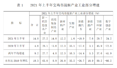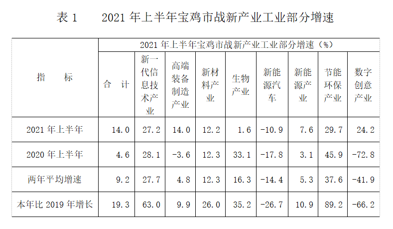 上半年,宝鸡市战略新兴产业增加值同比增长15.9%,增速超过GDP6.4个百分点;两年平均增长10.8%,较一季度加快2.8个百分点。其中,工业部分增长14.0%,增速超过规模以上工业增加值7.0个百分点。以下重点分析战新产业中工业部分的主要情况。