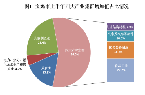 上半年,宝鸡市四大优势产业集群增加值占规模以上工业的比重为56.0%,同比增长8.6%,高于规模以上工业1.6个百分点,对宝鸡市增长的贡献率达到68.4%,拉动宝鸡市增长4.9个百分点,四大产业集群优势明显、支撑有力。四大产业集群增加值占比结构见图1。