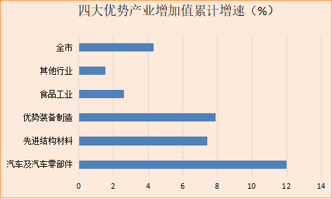 分行业看:全市35个行业大类中,19个行业增加值实现增长,四大优势产业集群同比增长6.3%,高于全市平均2.0个百分点,拉动全市增长3.6个百分点。其中,汽车及汽车零部件增长12.0%,拉动增长1.2个百分点;先进结构材料增长7.4%,拉动增长0.5个百分点;优势装备制造增长7.9%,拉动增长1.3个百分点;食品工业增长2.6%,拉动增长0.6个百分点。