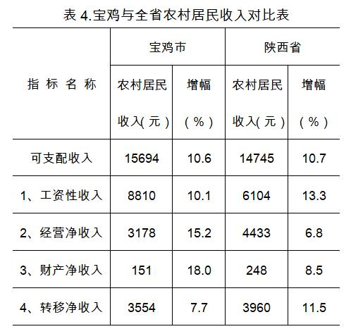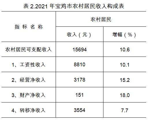 (二)农村居民人均收入:从总量上看,虽然2021宝鸡农村居民人均收入绝对量高于全省949元,但从四项够成来看,仍有三项收入低于全省,分别是经营性收入低于全省1255、财产性收入低于全省97元、转移性收入低于全省406元。从增速来看,2021宝鸡农村居民人均收入增长10.6%,低于全省0.1个百分点,主要是人均工资性收入增速低于全省3.2个百分点、人均转移性收入低于全省3.8个百分点所致。