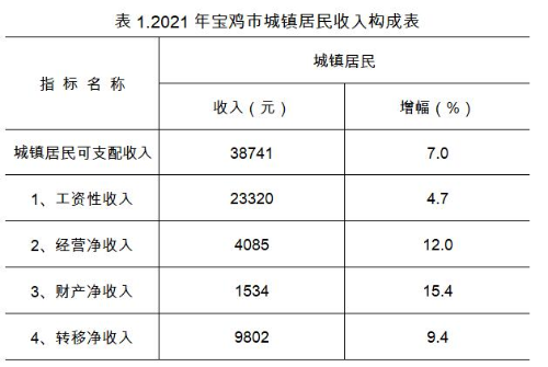 2021年,宝鸡全市城镇居民人均可支配收入38741元,比上年增长7.0%。全市农村居民人均可支配收入15694元,比上年增长10.6%。