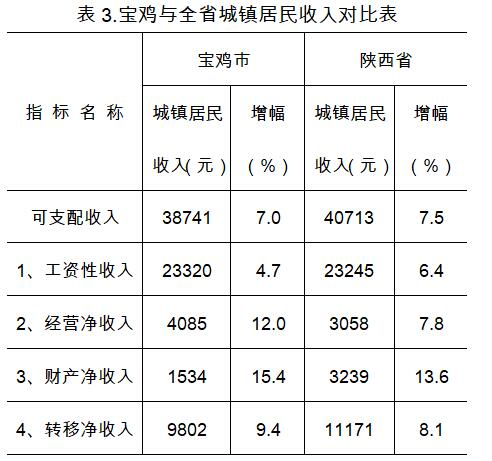 (一)城镇居民人均收入:从总量看,2021年全省城镇居民人均收入达到了40713元,宝鸡城镇居民人均收入38741元,低于全省1972元。主要原因在于,宝鸡城镇居民人均财产性收入1534元,低于全省1705元,不到全省水平的一半。城镇居民人均转移性收入9802元,低于全省水平1369元,这两项是形成宝鸡与全省差距的关键。从增速看,2021年宝鸡城镇居民人均收入增长7.0%,低于全省0.5个百分点,主要原因是,占总收入比重最大的工资性收入增速低于全省1.7个百分点。