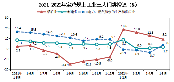 1-5月,全市规模以上采矿业增加值同比增长9.2%,拉动全市增长1.2个百分点;制造业增长1.7%,较1-4月加快1.2个百分点,拉动增长1.4个百分点;电力、热力、燃气及水生产和供应业扭转了今年以来的下降态势,增长3.6%,拉动增长0.2个百分点。