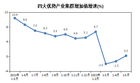 1-5月,四大优势产业集群增加值增速增长0.2%,较1-4月加快1.5个百分点。食品工业及先进结构材料持续发力,分别增长19.8%和6.6%,较一季度加快2.4个百分点和0.7个百分点,拉动全市增长4.7个百分点和0.5个百分点;优势装备制造下降6.6%,较1-4月收窄3.4个百分点,影响全市下降1.0个百分点;汽车及汽车零部件下降36.7%,影响下降4.0个百分点。