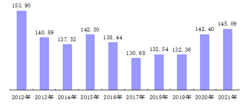 图1.2012-2021年宝鸡市粮食总产量(单位:万吨)