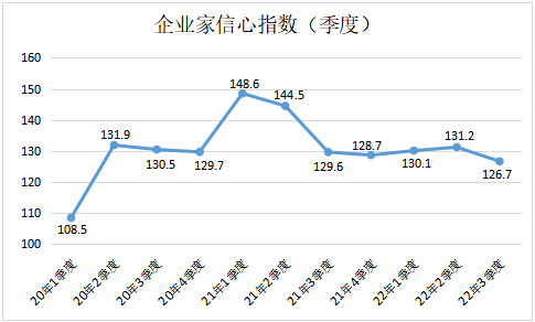 调查结果显示,三季度样本企业景气指数为126.1,处于[150,120)“较为景气”区间,分别较二季度和一季度回落3.6和2.2个百分点;企业家信心指数为126.7,分别较二季度和一季度回落4.5和3.4个百分点。