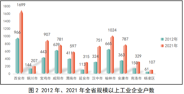 党的十八大以来,宝鸡市坚持扩增量与优存量同步,规模以上工业企业数量持续增加。截至2021年底,全市工业企业8721户,较2013年净增3611户。其中,规模以上企业907户,大中型企业93户,上市公司达到5户。规模以上工业企业户数占全省比重为11.9%,较2012年提高1.5个百分点。在全省11个地市中,2021年宝鸡市规模以上工业企业数量居第3位,仅少于西安市、榆林市。见图2