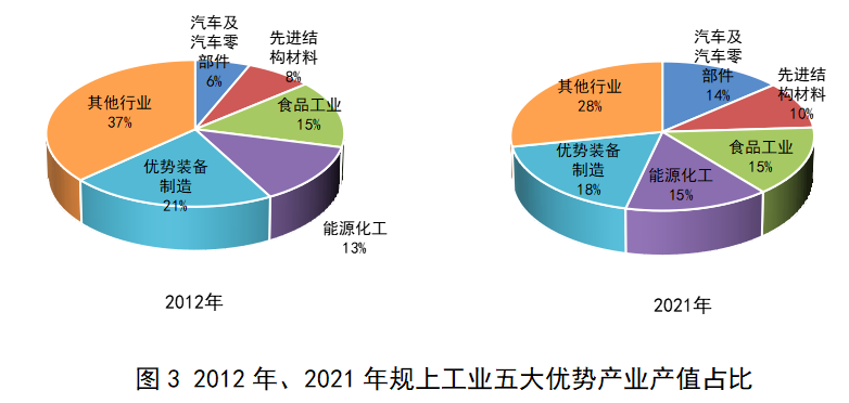 图3 2012年、2021年规上工业五大优势产业产值占比