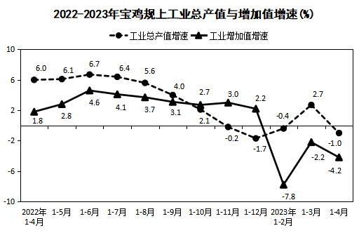 1-4月,全市982户规模以上工业企业工业总产值较上年下降1.0%,增加值下降4.2%,较一季度回落2.0个百分点。4月当月,工业总产值下降6.2%,增加值下降4.1%。