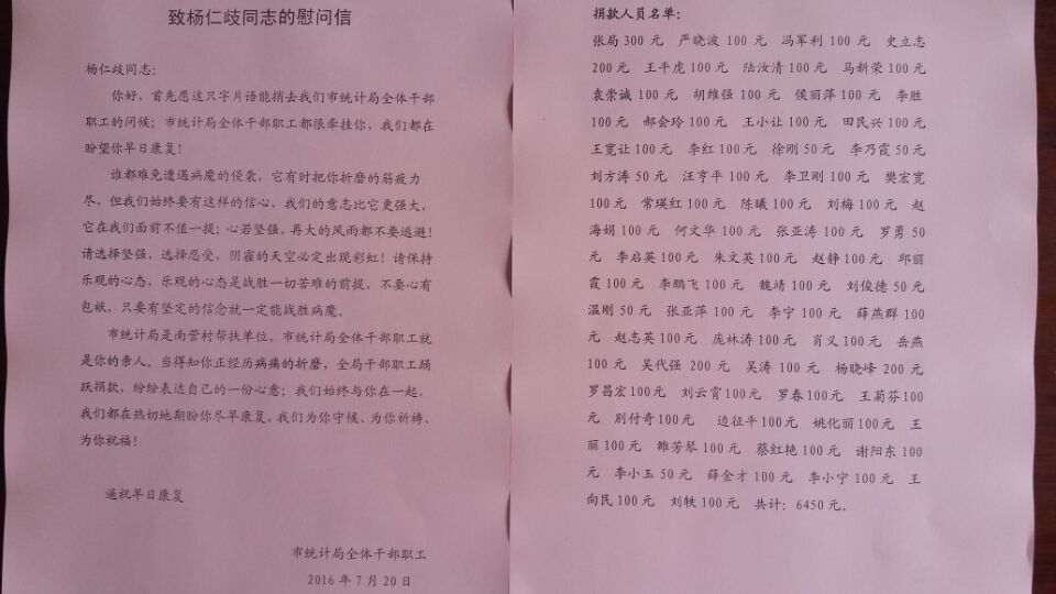 在得知杨仁歧正经历病痛的折磨,全局干部职工踊跃捐款,纷纷表达自己的一份爱心。当杨仁歧同志从史立志组长手中接过市统计局全体干部职工的捐款时流下了感动的泪水,并深情地说:感谢政府和组织的关怀,感谢市统计局全体干部职工的牵挂!史立志组长还叮嘱杨仁歧的弟弟要照顾好自己哥哥,有什么情况和要求就跟村上干部反映,或直接跟我们包扶干部联系。
