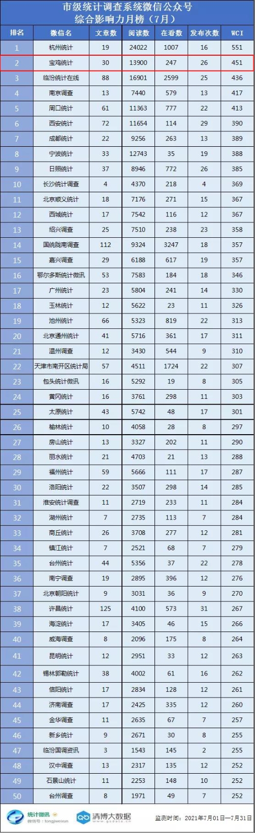 近日,国家统计局公布了2021年7月份全国统计调查系统微信公众号综合影响力月度排行榜,宝鸡统计微信公众号获得市级排名全国第二,综合排名全国第十九的佳绩。