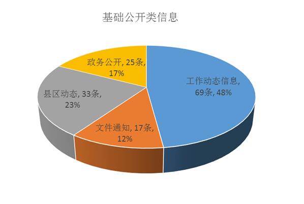 基础公开类信息144条,占总体的比例为17.6%。内容分别为:1、工作动态信息69条;2、文件通知17条;3、县区动态33条;4、政务公开25条。