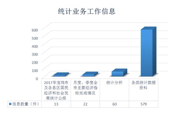 统计业务工作信息类674条,占总体的比例为82.4%。主要包括:1、2017年宝鸡市及各县区国民经济和社会发展统计公报13条;2、月度、季度全市主要经济指标完成情况22条;3、统计分析60条;4、各类统计数据资料579条。