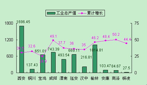 1-7月,受国家调控政策和去年基数影响,全省工业经济增长平稳,增速有所减缓。全省规模以上工业实现工业增加值2218.06亿元,增长22.1%,增速同比加快12.6个百分点,但较上半年回落2.7个百分点。与去年同期相比,十市一区工业增速普遍加快,增速增幅最大的延安加快了56.2个百分点,增幅最小的宝鸡也加快了9.2个百分点;与今年上半年相比,有6个市区增速减缓,分别为延安、安康、汉中、商洛、榆林和渭南,增速分别减缓5.5、2.1、2、1.4、1.3、0.5个百分点,其余市区增速加快,其中杨凌增长最快,加快了4.3个百分点。从绝对值来看,西安市(1696.45亿元)、榆林市(1014.81亿元)和咸阳市(743.39亿元)位列前三名。