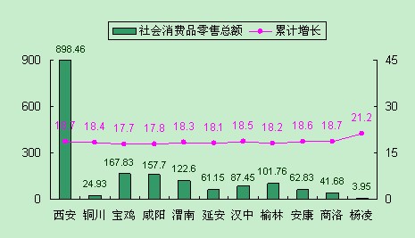 1-7月,我省社会消费品零售总额为1730.33亿元,增长18.4%。三大区域中,关中和陕南均衡发展,增速为18.5%和18.6%,陕北增长较慢,为18.1%。十市一区中,杨凌仍保持最快增速,达到21.2%;宝鸡仍最慢,为17.7%。与上半年相比,宝鸡和延安增速加快了0.1个百分点,杨凌、商洛和西安增速减缓0.3、0.1、0.1个百分点,其余市区增速持平。从绝对值来看,西安(898.46亿元)居于首位,超过全省消费品零售总额的一半,宝鸡(167.83亿元)和咸阳(157.7亿元)分列二、三位。