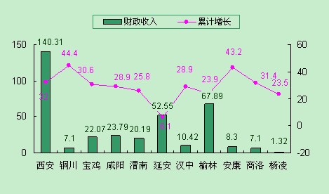 1-7月,全省财政收入1057.54亿元,增长29.1%,同比加快10.7个百分点,较上半年加快1个百分点。十市一区中,铜川、安康和西安增速排前三,为44.4%、43.2%和32%;延安增速排名最后,为6.1%。与上半年相比,咸阳、西安和延安增速回落,分别回落3.8、1.5和0.9个百分点;其余市区增速加快,其中铜川、汉中和杨凌加快最多,分别加快了7.6、4.8和4.6个百分点。从绝对值来看,名列前三位的分别是西安(140.31亿元)、榆林(67.89亿元)和延安(52.55亿元)。