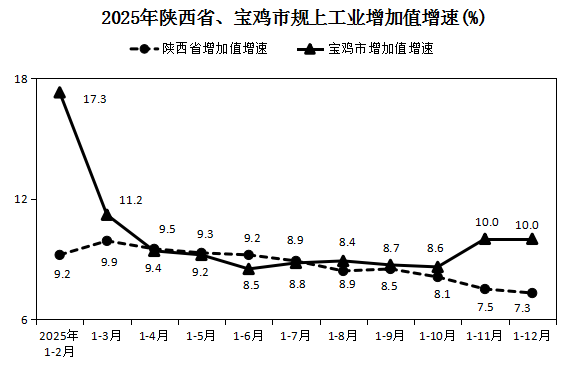 2025年,全市1074户规模以上工业企业实现增加值较上年同期增长10.0%,增速较上年加快2.1个百分点分别高于全国、全省5.0和2.7个百分点,拉动全市GDP增长2.4个百分点。尽管受宝鸡卷烟厂生产计划前移等因素影响,全年增速较一季度回落1.2个百分点,但工业持续增长态势未变,总体发展更趋稳健。
