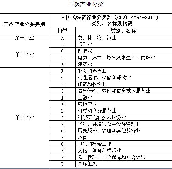 三次产业分类:第一产业是指农、林、牧、渔业(不含农、林、牧、渔服务业)。第二产业是指采矿业(不含开采辅助活动),制造业(不含金属制品、机械和设备修理业),电力、热力、燃气及水生产和供应业,建筑业。第三产业即服务业,是指除第一产业、第二产业以外的其他行业。第三产业包括:批发和零售业,交通运输、仓储和邮政业,住宿和餐饮业,信息传输、软件和信息技术服务业,金融业,房地产业,租赁和商务服务业,科学研究和技术服务业,水利、环境和公共设施管理业,居民服务、修理和其他服务业,教育,卫生和社会工作,文化、体育和娱乐业,公共管理、社会保障和社会组织,国际组织,以及农、林、牧、渔业中的农、林、牧、渔服务业,采矿业中的开采辅助活动,制造业中的金属制品、机械和设备修理业。