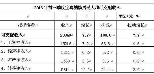 1.城镇居民人均可支配收入增长7.7%。前三季度宝鸡市城镇居民人均可支配收入达到23840元,比全省平均水平高出2280元,居全省11个设区市第三位;城镇人均可支配收入同比增长7.7%,增幅较上半年提高0.2个百分点,比全省增幅高0.1个百分点,居全省11市第四位。比全国平均水平低1497元,比全国平均增幅低0.1个百分点。