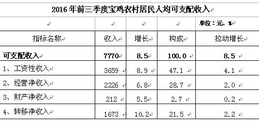 2.农村居民人均可支配收入增长8.5%。前三季度宝鸡市农村居民人均可支配收入为7770元,比全省平均水平高出658元,居全省11个设区市第五位;农村人均可支配收入同比增长8.5%,增幅与全省持平,居全省11市第四位,比上半年提高一位次。比全国平均水平低1228元,比全国平均增幅高0.1个百分点。
