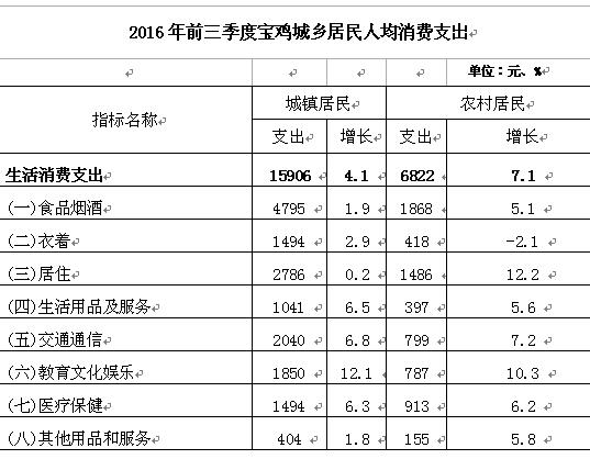 1.城镇居民人均消费支出增长4.1%。前三季度宝鸡市城镇居民人均消费支出为15906元,同比增长4.1%。