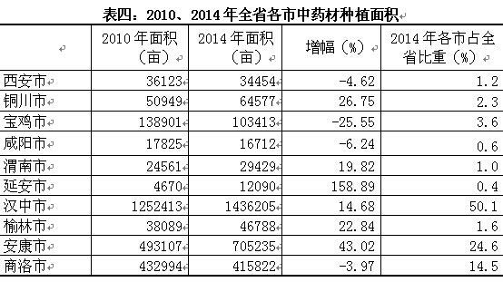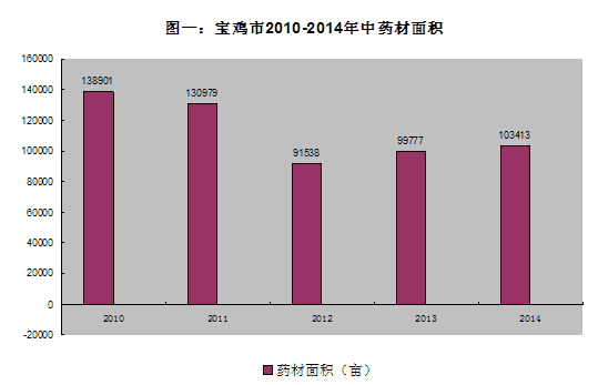 宝鸡市中药材面积占全省总量的3.6%,仅次于陕南三市,排在全省第四位。与2010年相比,2014年全省共四个市中药材面积减少,宝鸡市减幅25.55%,为全省最多。