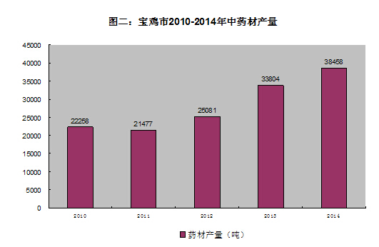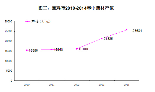 宝鸡市中药材产值从2010年的1.5亿元增长到2014年的2.6亿元,增幅达73%,平均增长13.8%。