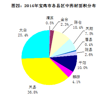 根据2014年数据,凤县中药材种植面积3.8万亩,占全市总面积的36.8%;太白县2.6万亩,占全市总面积的25.4%;陈仓区1.07万亩,占全市总面积的10.4%;千阳县1.03万亩,占全市总面积的10%;凤翔县7.8万亩,占全市总面积的7.5%。麟游县、陇县、金台区、渭滨区、眉县面积依次为4230亩、2731亩、2335亩、513亩、450亩,分别占全市总面积的4.1%、2.6%、2.3%、0.5%和0.4%。