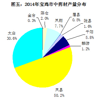 2014年,凤县中药材产量1.9万吨,占全市总产量的一半,太白县紧随其后,产量1.2万吨,占全市总产量的30.6%,其余县区除岐山、扶风无产量外,共计7406吨,仅占全市总产量的19.2%。