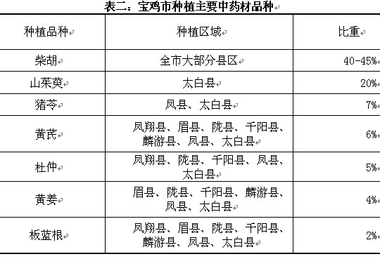 根据2014年数据,柴胡约占宝鸡市中药材总量的40%以上,宝鸡市大部分县区都有种植,其中凤县中药材面积的60%以上为柴胡,陈仓区西山地区发展了近万亩的柴胡种植,是陈仓区中药材的主要组成部分。山茱萸主要集中在太白县,在宝鸡市中药材总量中约占20%。猪苓在中药材总量中占比7%左右,主要分布在凤县,太白县有少量种植。黄芪有6%左右,分布在宝鸡市大部分县区,其中60%在凤县。杜仲有5%左右,分别在凤翔、陇县、千阳、凤县、太白,其中凤县有73%。