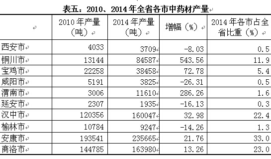 中药材产量占全省总量的5.4%,排在全省第五位,低于汉中、商洛、安康、铜川。