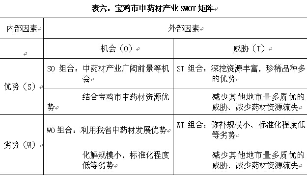 外部机会和自身优势结合,采用成长型战略,充分利用外部机会,发挥自身优势。中药材产业具有广阔的市场前景,政府重视度高,市场需求量大,技术发展成熟,为宝鸡市中药材发展提供了契机,是产业外部给予的机会。充分利用中、省对中药材产业发展的政策支持,以市场需求为导向,充分利用宝鸡市中药材资源丰富的优势,因地制宜、科学合理的制定中药材产业发展战略,促成宝鸡市中药材产业的兴起。