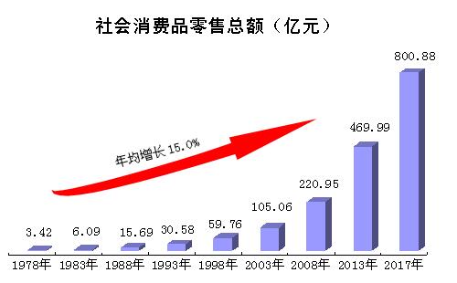 改革开放前,计划经济体制下,由于生产力水平较低,物资短缺,基本实行凭票配给,商品流通不畅。改革开放后,市场放开,宝鸡物资供应逐步充盈,逐步形成了商品供应齐全、城乡覆盖密集的商贸流通体系。随着经济发展,商贸模式也几经变迁,从供销社、集贸市场发展到超市、专业市场,近年来,开元商城、高新天下汇、新东岭城市综合体等综合性购物中心先后建成运营,宝鸡的购物环境不断改善,商业中心不断拓展,商贸水平不断提升。2017年,全市社会消费品零售总额达800.88亿元,是1978年3.42亿元的234倍,期间年均增长15.0%。图三