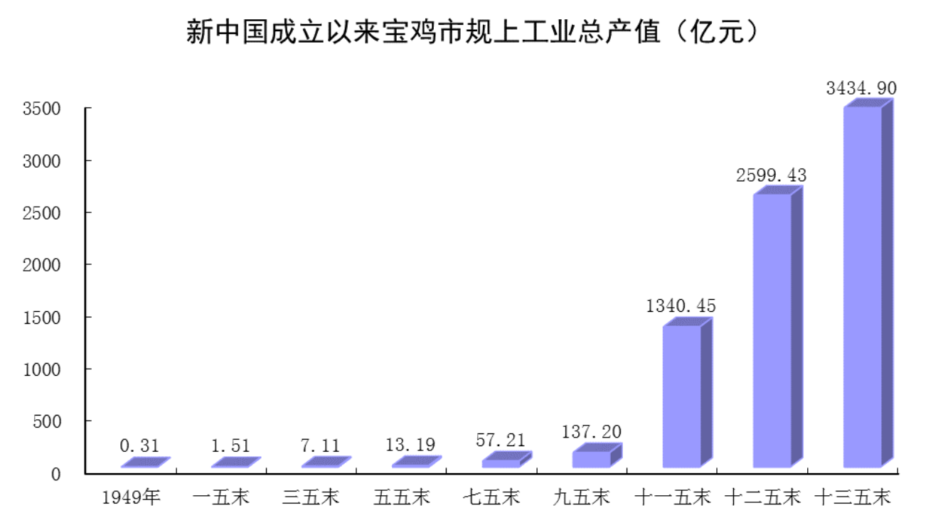 1949年,宝鸡仅74户小微工业企业,工业总产值仅0.31亿元;2020年末,全市规模以上工业企业达到823户,规模以下工业企业4000余户,全年完成规模以上工业总产值3434.9亿元,是1949年的11080倍,是1978年的252.8倍。1949-2020年,规模以上工业总产值年均增长14.0%。2020年,全市实现工业增加值1024亿元,达到1990年的54.4倍,期间年均增长14.3%。