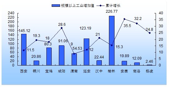 1-2月,全省规模以上工业企业实现增加值874.08亿元,同比增长17.3%,高于全国5.9个百分点,高于去年同期2个百分点。从增速看,安康、商洛、咸阳和杨凌分别以35.5%、32.2%、28.6%和24.8%的增幅名列前四,增长都在20%以上,西安和渭南以11.5%和9.0%的增速位居最后。从绝对值看,榆林、西安和延安名列前三位,规模以上工业增加值分别为226.77、145.12和123.19亿元,都在100亿元以上,占到全省规模以上工业增加值的56.6%。