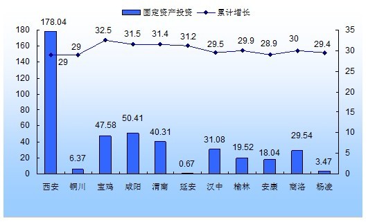 1-2月,全省完成固定资产投资462.24亿元,同比增长28.6%,增速与上年持平。从增速看,宝鸡(32.5%)、咸阳(31.5%)、渭南(31.4%)增长最快,西安(29.0%)、铜川(29.0%)、安康(28.9%)排名最后三位。与去年同期相比,只有3个市固定资产投资增速加快,分别为铜川、渭南和商洛,各加快14.9、2.4和1.1个百分点;其他8个区市增速都有所下降,宝鸡、汉中、杨凌、咸阳增速下降幅度都在10个百分点以上。从绝对值看,西安、咸阳、宝鸡名列前三位,分别为178.04、50.41和47.58亿元。