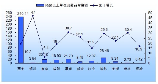 1-2月,全省限额以上企业实现消费品零售额366.56亿元,同比增长20.2%,增速比去年同期下降5.8个百分点,居民消费增速有所回落。十市一区中,铜川、渭南、商洛消费增长最快,增速分别达到47.0%、30.7%和30.4%;宝鸡和汉中消费增长最慢,增速为6.4%和15.2%。与去年同期相比,有5个市增速减缓,宝鸡消费增速下滑幅度最大,下降了25个百分点;6个区市增速加快,铜川(13.4%)和榆林(15.2%)增速提高在10个百分点以上。从绝对值来看,西安(240.44亿元)居于首位,占全省限额以上消费品零售额的65.6%,榆林和渭南分别以28.46和21.73亿元的零售额紧跟其后。
