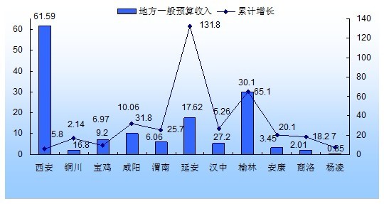 1-2月份,全省完成财政总收入412.62亿元,增长13.4%,比去年同期下降30.2个百分点;实现地方一般预算性收入220.83亿元,增长30.0%,增幅同比下降9个百分点。从增速看,延安(131.8%)和榆林(65.1%)增长最快,宝鸡(9.2%)、杨凌(7.0%)和西安(5.8%)增长最慢,都在10个百分点以下。与去年同期相比,只有3个市一般预算收入增速上升,延安从上年同比下降转为同比上升,并且增幅最大,提高了133.3个百分点,8个区市增速下降,杨凌和汉中降幅最大,分别下降了110.9和64.3个百分点。从绝对值看,一般预算收入排名前三的为西安(61.59亿元)、榆林(30.1亿元)和延安(17.62亿元)。