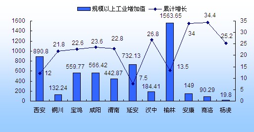 1-10月,全省规模以上工业实现增加值5361.01亿元,同比增长16.5%,增速较前三季度加快0.1个百分点,高于全国6.5个百分点,连续5个月保持全国首位。从增速看,商洛和安康增长最快,增速分别为34.4%和34.0%;榆林、西安和延安增长最慢,增速各为13.5%、12%和7.5%。与1-9月相比,各区市增速变化不大,榆林和安康增速不变,其他区市增速变动幅度均在1个百分点以内,有6个区市增速加快,铜川和西安增幅最高,提升了0.8和0.4个百分点,3个区市增速小幅减缓。从绝对值看,榆林以1563.65亿元的规模工业增加值遥遥领先,西安和延安以890.80和732.13亿元紧跟其后。