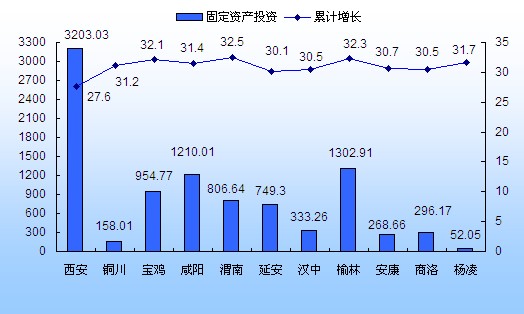 1-10月,全省实现固定资产投资9881.86亿元,同比增长28.4%,增速与1-9月持平,继续保持较快增长,高于全国7.7个百分点。从增速看,除西安(27.6%)增速低于30%以外,其余区市增速均在30%以上,其中渭南、宝鸡和榆林增速最高,分别为32.5%、32.3%和32.3%。与1-9月相比,有5个区市增速不变,分别为西安、渭南、榆林、安康和商洛;6个区市增速有所加快,增幅在0.2个百分点之内。从绝对值看,西安、榆林和咸阳固定资产投资额排名前三位,分别为3203.03、1302.91和1210.01亿元。