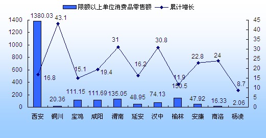 前10个月,全省限额以上企业实现消费品零售额2098.25亿元,同比增长18.1%,增速较前三季度提高0.6个百分点。从增速看,铜川、渭南和汉中名列前三,增速分别为43.1%、31%和30.8%;榆林和杨凌增速最低,分别为11.9%和8.7%。与1-9月相比,有7个区市增速加快,延安和宝鸡增幅最大,分别为1.4和1.1个百分点;4个区市增速减缓,榆林和商洛降幅最大,各下降2.3和1.5个百分点。从绝对值看,西安限额以上单位消费品零售额最高,为1380.03亿元,榆林和渭南分别以150.50和135.05亿元居于二、三名。
