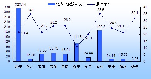 前10个月,全省完成财政总收入2214.40亿元,同比增长15.8%;实现地方财政收入1219.06亿元,增长21.7%,比前三季度小幅下降0.6个百分点。从增速看,榆林、铜川和杨凌排名前三,增速分别为35.5%、34.9%和32.1%;汉中和延安排名最后,增速分别为20.1%和11.0%。与前三季度相比,榆林增速不变,有5个区市增速下降,杨凌和西安降幅最大,分别下降了11.8和2.1个百分点;5个区市增速加快,汉中和延安增幅最大,分别加快了2.2和2.1个百分点。从绝对值看,西安、榆林和延安一般预算收入最高,分别为323.14、193.30和111.51亿元,其余区市一般预算收入都在100亿元以下。(摘自陕经网)