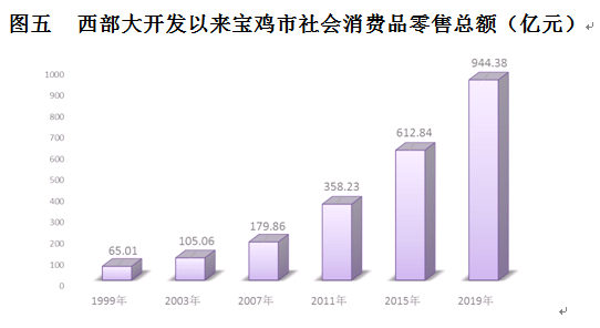 20年来,商贸模式快速变化,新业态、新模式快速成长,网络营销异军突起,新型多元化销售网络迅速形成。开元商城、高新天下汇、新东岭城市综合体、吾悦广场等综合性购物中心先后建成运营,宝鸡的购物环境不断改善,商业中心不断拓展,商贸水平不断提升,今天的宝鸡已形成消费市场遍布城乡、流通网络四通八达、名优品牌应有尽有、消费内容丰富多元的商贸流通格局。2019年,全市社会消费品零售总额达944.38亿元,是1999年的14.5倍,期间年均增长15.1%。